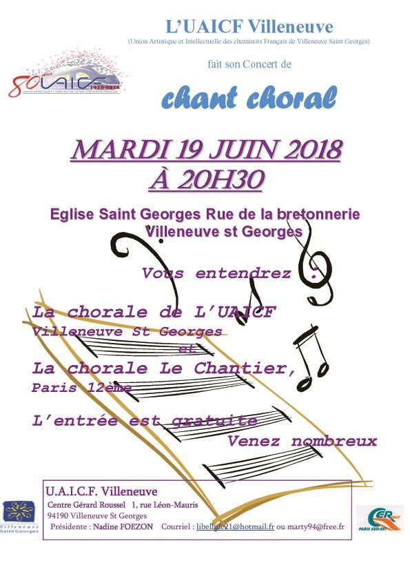 Concert à Villeneuve St-Georges 13 Juin 2018 La Chorale UAICF de Villeneuve St Georges vous donne rendez vous Mardi 19 Juin à 20h30 pour un Concert à l'église Saint-Georges - Rue de la Bretonnerie - Villeneuve St Georges.Entrée Gratuite. Publicité Tag(s) : #Pub Copinage